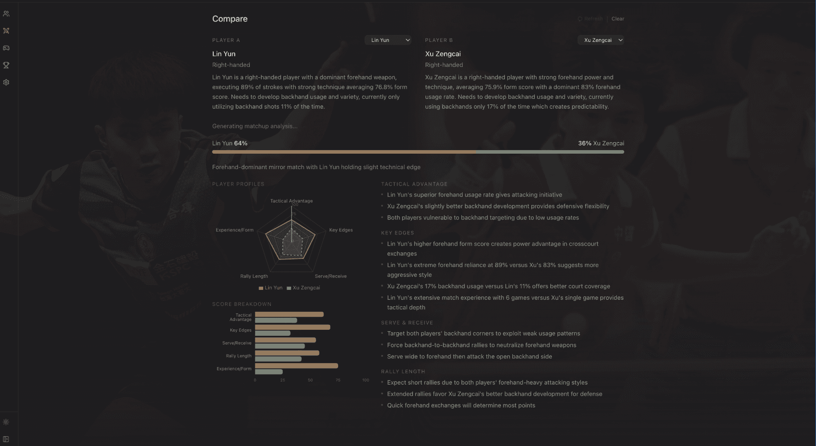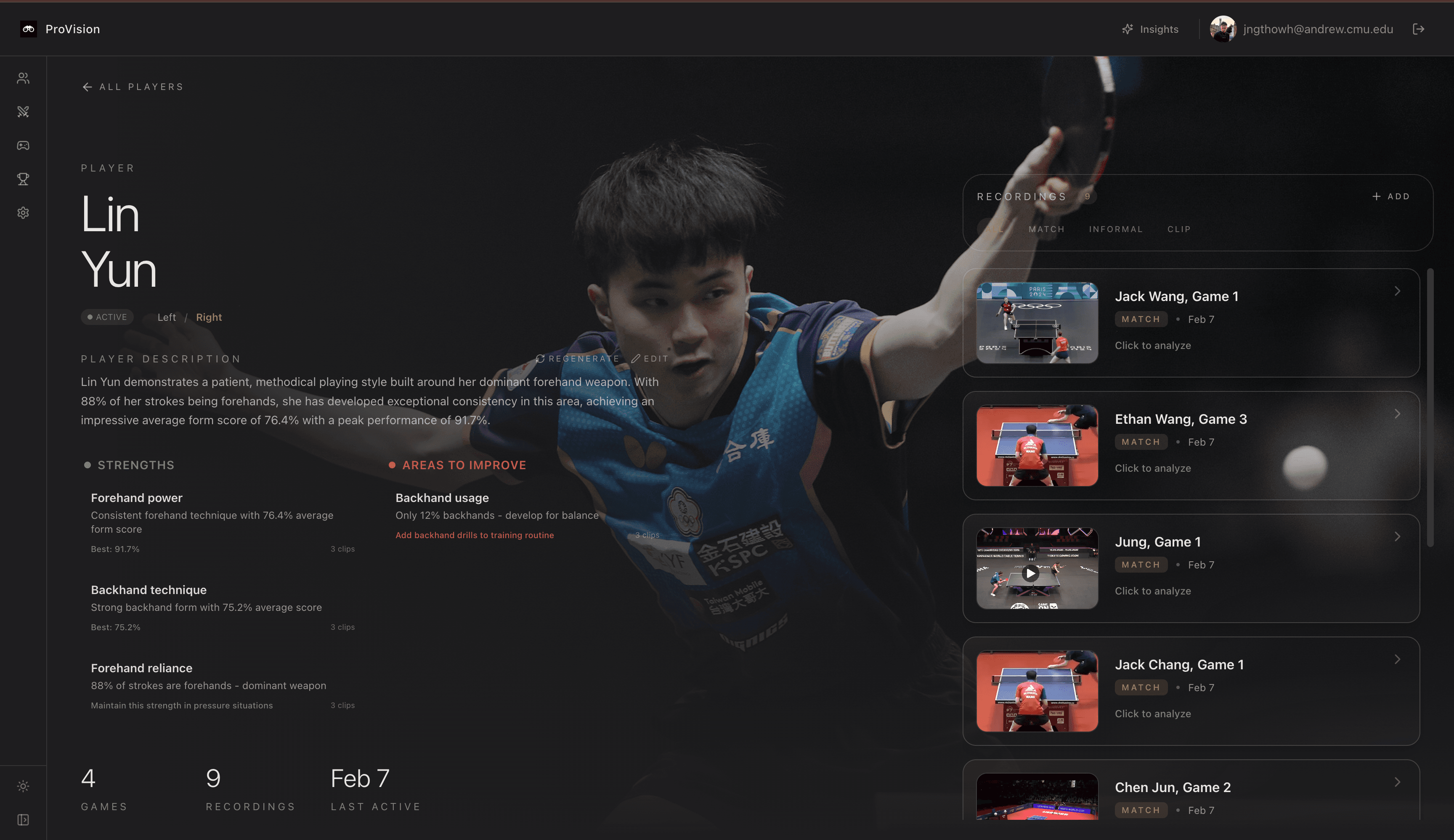 ProVision is AI Moneyball for Table Tennis. It transforms match film and tournament footage captured by 2D camera into actionable insights backed by tracked ball trajectories, 3D biomechanics, and Moneyball-grade analytics in minutes.