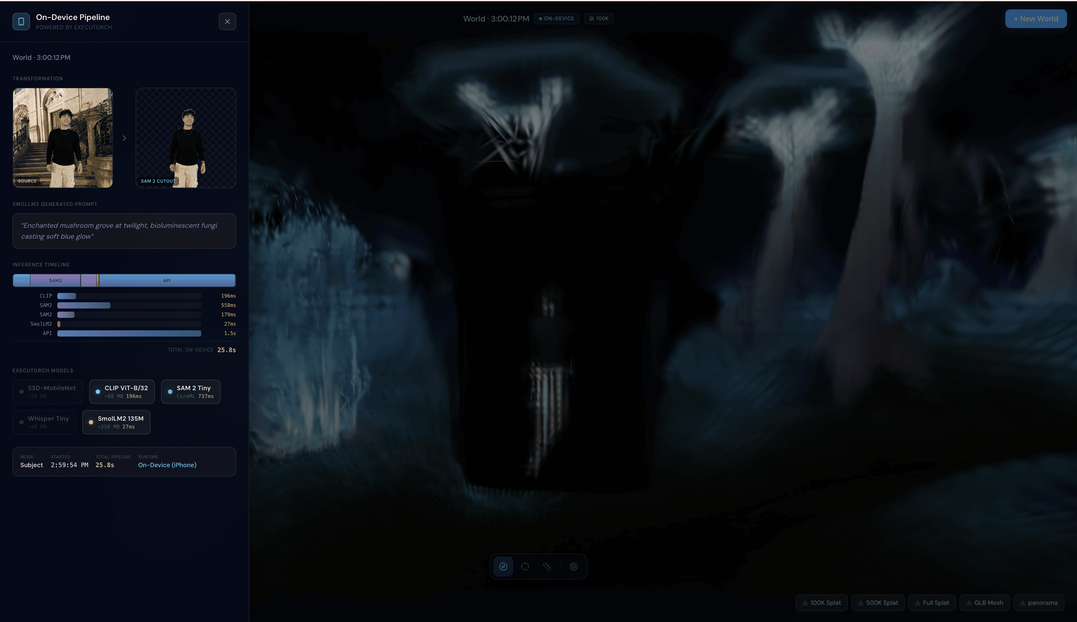 AI World Generation and Spatial Intelligence from iPhone Camera. WorldGen takes a photo or video on iPhone, runs a full on-device ML pipeline of 5 models entirely on the phone. The resulting transparent cutout gets uploaded to a spz Gaussian Splat rendered in Three.js on the web.